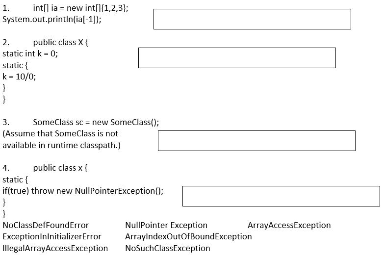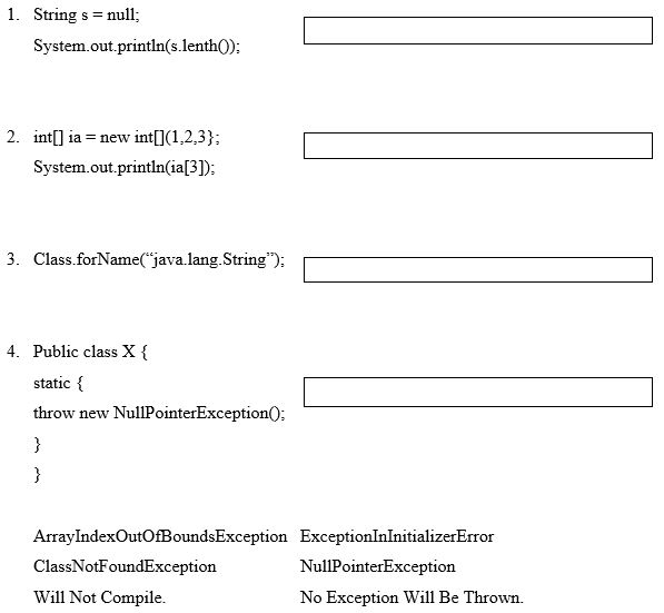 Identify the Exceptions that will be received when the code snippets on the left hand side are executed.