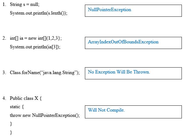 Identify the exceptions that will be received when the code snippets on the left hand side are executed.